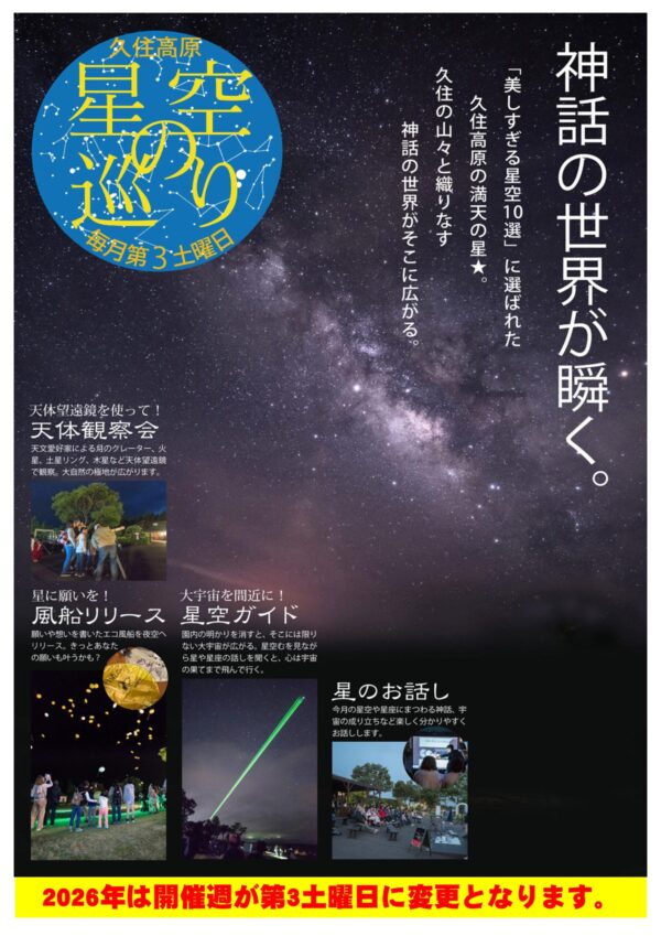 「久住高原星空の巡り」 次回は2025年12月27日(土)19時スタート!!! ※標高が高く夜間は気温も平地よりかなり低くなります。 冬物の上下着など防寒対策を必ずお願い致します。 2026年(令和8年)は毎月第3土曜日の開催となります。 ※新月の周期の関係上、開催週は毎年変更します。 星のお話し(19:00) ⇒ 星空ガイド(20:00)⇒ 風船リリース(20:20) 天体望遠鏡コーナー(自由参加)あります。 参加料/大人600円 小人400円 (予約不要)