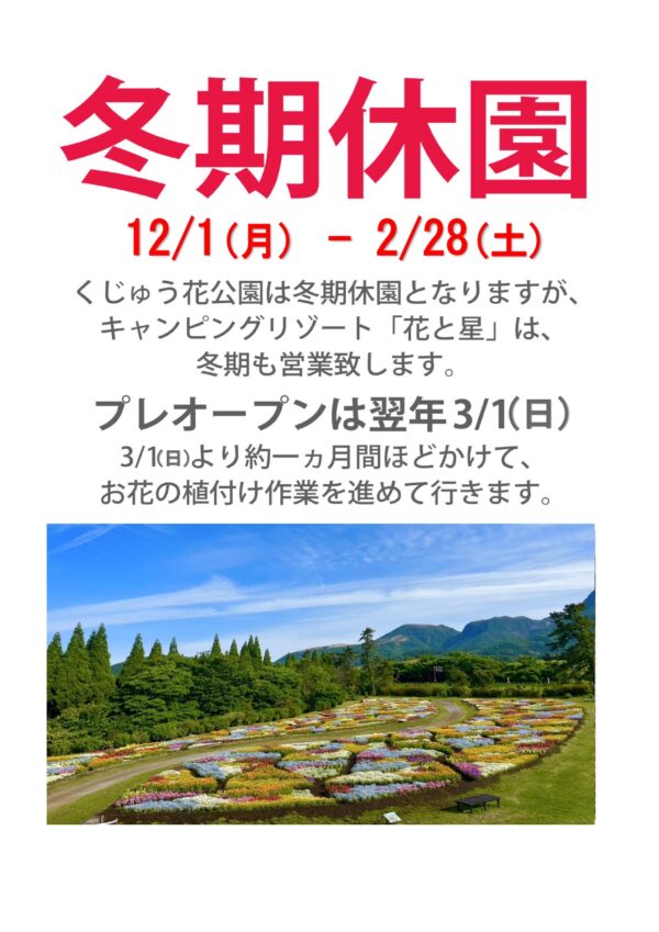 11月17日(月)よりくじゅう花公園の営業時間を下記の通り変更致します。